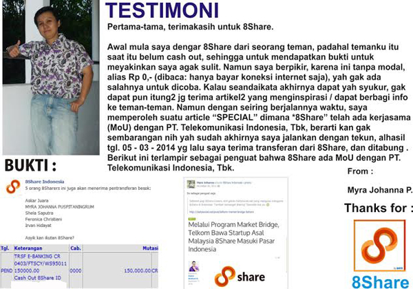 Semoga dua testimoni ini bisa membuat anda semakin yakin untuk mengejar Rupiah tambahan bersama 8Share Indonesia.